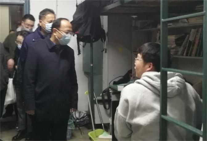 陈国龙带队先后来到了图书馆及学生宿舍4号、5号楼,对图书馆及学生宿舍的疫情防控、应急处置、消防安全、日常卫生管理等工作开展现场督查。陈国龙重点检查了学生宿舍日常消杀、内务整理、规范用电情况等,就检查中发现的问题隐患与相关职能部门负责同志进行了现场交流,指出隐患的严重性并提出整改要求。督查过程中,陈国龙与同学们进行了亲切互动交流,深入了解同学们目前的生活、学习、思想状态,勉励大家专注学习、强健体魄。他对广大同学积极配合学校严格的疫情防控措施给予充分肯定,同时要求广大同学克服松懈情绪与侥幸心理,做好健康监测,在校园疫情防控“大考”中以平凡的坚守作出不平凡的贡献。