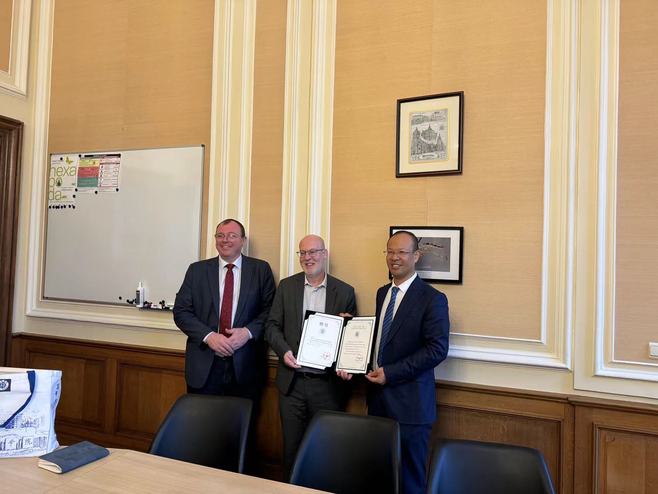 在比利时,出访团一行首先访问了列日大学让布卢农业生物技术学院,与院长弗里德里克·弗朗西斯等进行了会谈,并实地考察该院的食品研发中心。孙艳辉向该校食品专业负责人布莱克·克里斯托弗博士颁发了客座教授聘书。出访团与列日大学中国博士留学生举行了人才招聘座谈会,孙艳辉介绍了776net必赢官网的高层次人才引进政策。