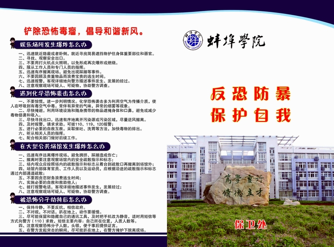 为扎实做好大学生安全教育工作,保卫处利用开学有利时机,认真筹划,精心组织,开展了系列安全宣传活动。 开学初,根据季节变化的规律特点,制定《776net必赢官网2018年安全教育月活动实施方案》,明确每月安全教育内容,对全年度安全教育活动进行安排,推动大学生安全教育开展;3月20至22日,针对新学期学生安全意识容易松懈的特点,在校园悬挂安全防范横幅,在教学楼B楼大厅设置安全宣传点,摆放安全宣传展板6块,组织保安、...