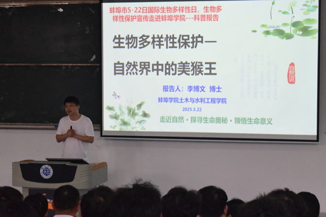 启动仪式结束后,活动邀请了土木与水利工程学院李博文博士做了《生物多样性保护——自然界中的美猴王》科普讲座,讲座通过生动的案例图片与前沿科研成果,向全市生态环境工作者及高校师生揭示了不同猴子的形态、种类、生活习性以及在生态系统中的关键作用,引发观众对灵长类生物多样性保护的深度思考,并且深入解读生物多样性保护的科学内涵、生物多样性面临的风险、挑战与实践路径。讲座后,还进行了生物多样性保护宣传走进怀远县四方湖湿地公园活动。