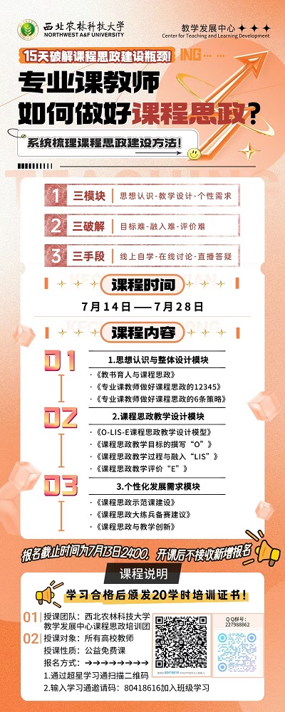 完成并达到培训要求的教师,将获得西北农林科技大学颁发的培训证书。教师发展与服务中心将给予继续教育学时的认定。