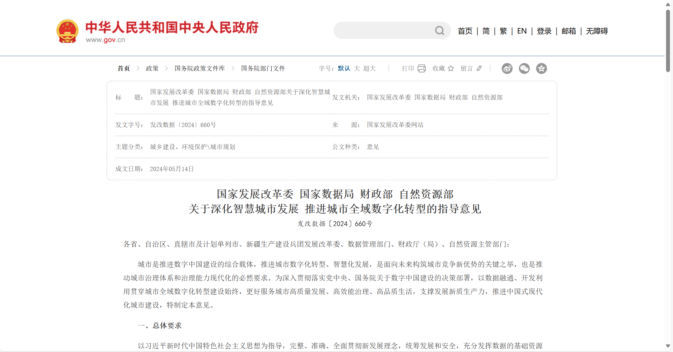 国家发展改革委 国家数据局 财政部 自然资源部 关于深化智慧城市发展 推进城市全域数字化转型的指导意见